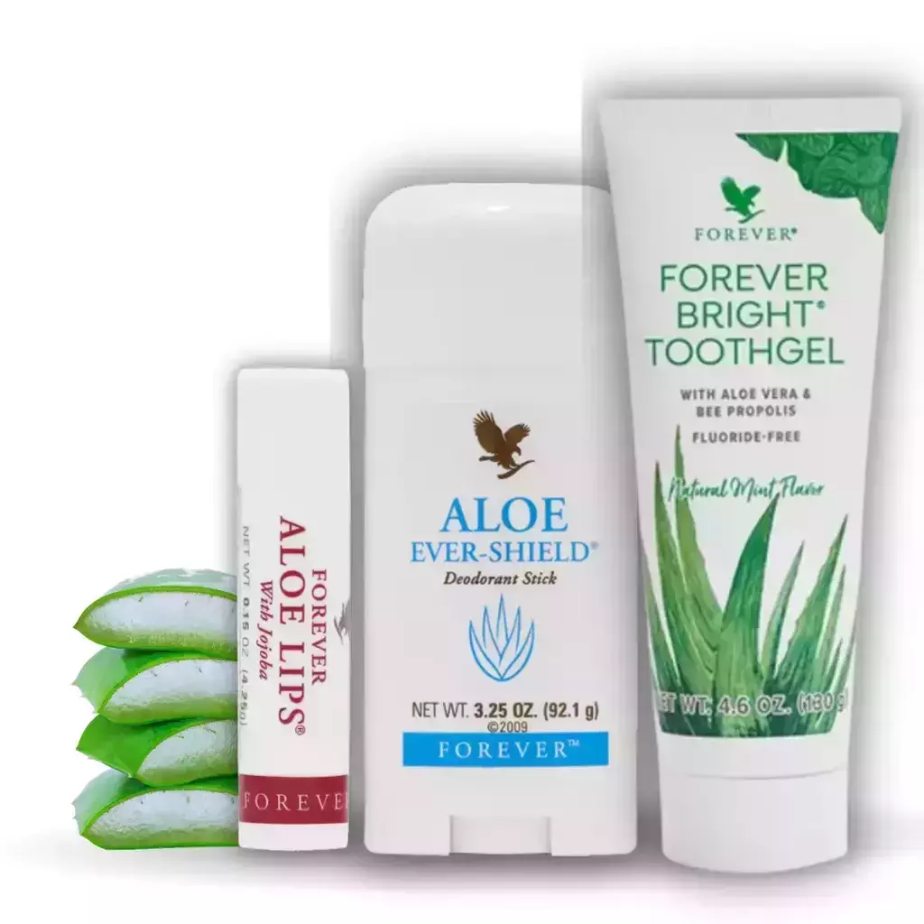 Invista no seu bem-estar com o Kit Desodorante + Gel Dental + Protetor Labial da Forever! Sinta a diferença da aloe vera em cada aplicação e viva com mais frescor, proteção e hidratação.